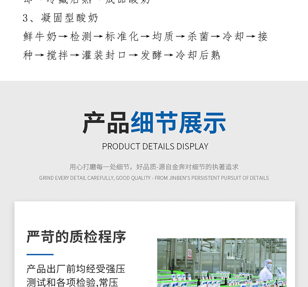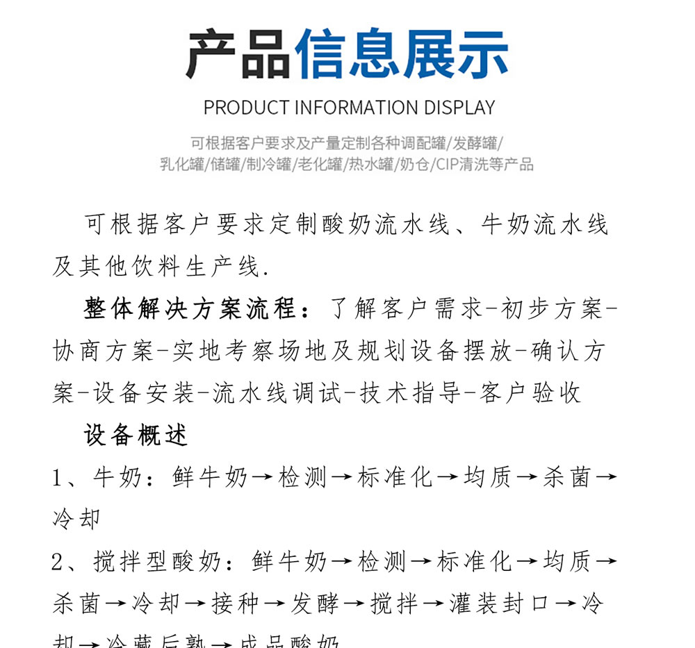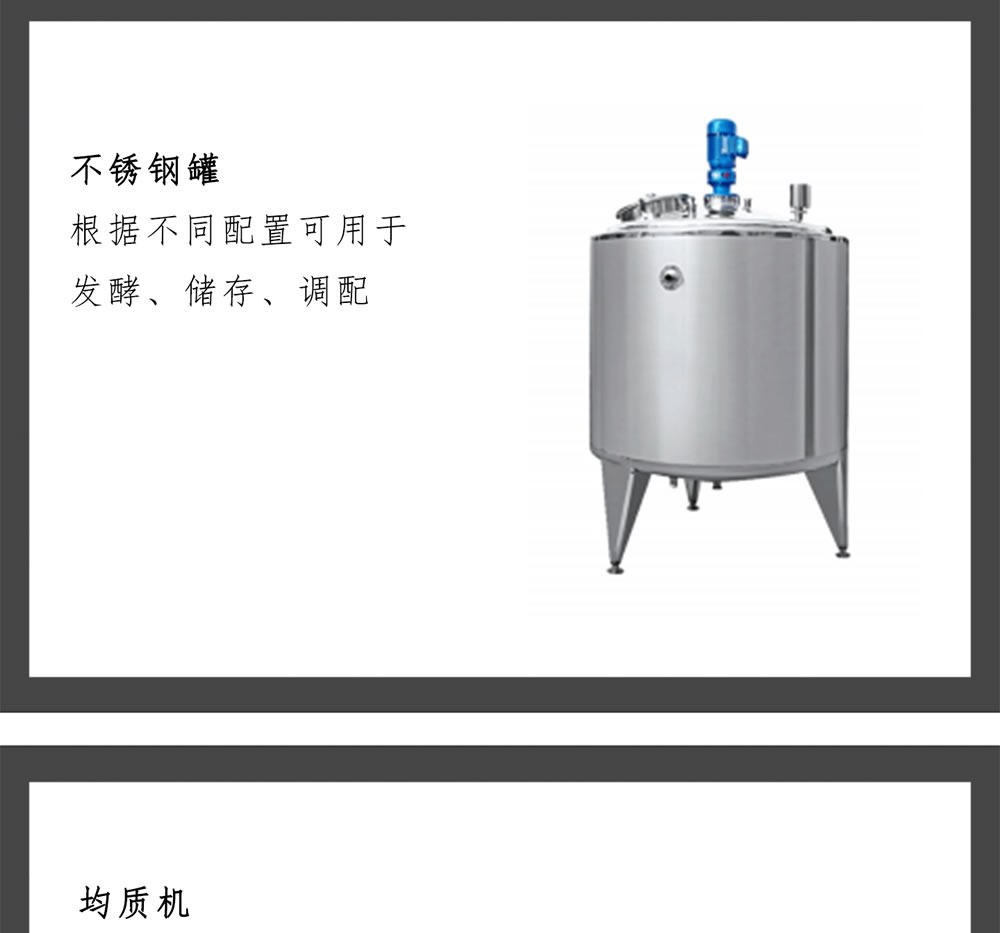 酸奶(nai)(nai)(nai)生(sheng)(sheng)產(chan)(chan)線主要包(bao)含各種風味的滅(mie)菌鮮奶(nai)(nai)(nai)、巴(ba)氏奶(nai)(nai)(nai)、還(huan)原奶(nai)(nai)(nai)、花生(sheng)(sheng)奶(nai)(nai)(nai)、學生(sheng)(sheng)奶(nai)(nai)(nai)等的均質(zhi)、冷卻、發酵、攪拌、儲存等設(she)備。我公(gong)(gong)司專(zhuan)業(ye)設(she)計與(yu)制作調配型酸奶(nai)(nai)(nai)生(sheng)(sheng)產(chan)(chan)線、花生(sheng)(sheng)奶(nai)(nai)(nai)生(sheng)(sheng)產(chan)(chan)線、牛奶(nai)(nai)(nai)生(sheng)(sheng)產(chan)(chan)線。我公(gong)(gong)司生(sheng)(sheng)產(chan)(chan)的酸奶(nai)(nai)(nai)生(sheng)(sheng)產(chan)(chan)設(she)備質(zhi)量可靠,供貨及時(shi),售后完善,值得信賴,歡迎各界酸奶(nai)(nai)(nai)制作企業(ye),浙江金(jin)奔機械制造(zao)有限公(gong)(gong)司18072010088 www.jbmach.com