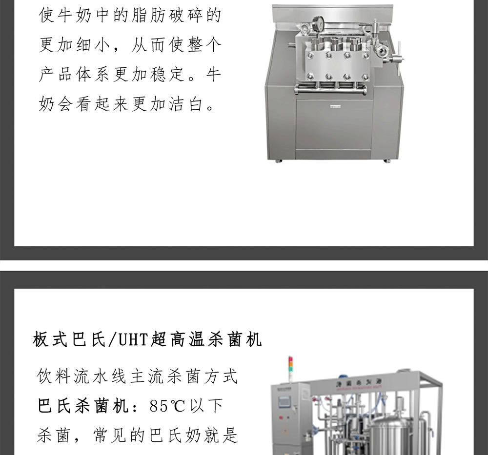 1、均質機械設備:均質就是通過把較大的脂肪球顆粒粉碎成無數接近于液體分子大小的脂肪球微粒,并使之均勻一致地分散在乳液中,在顆粒與分子之間獲得耦合力,從而防止混合液體產生分離。