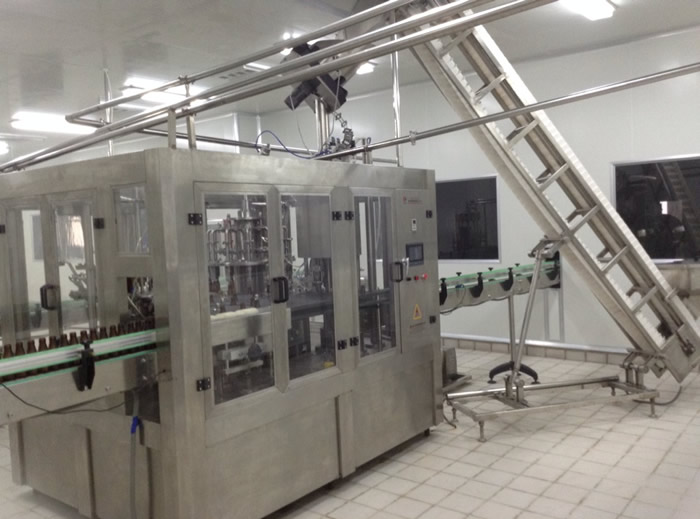 3.飲料灌裝生產線采用卡瓶頸懸掛運行工態設計,從而使整線運行功能更加可靠,克服了由于瓶壁薄、瓶高度誤差而引起的機器不能正常運轉的因素。更換瓶型方便快捷。
